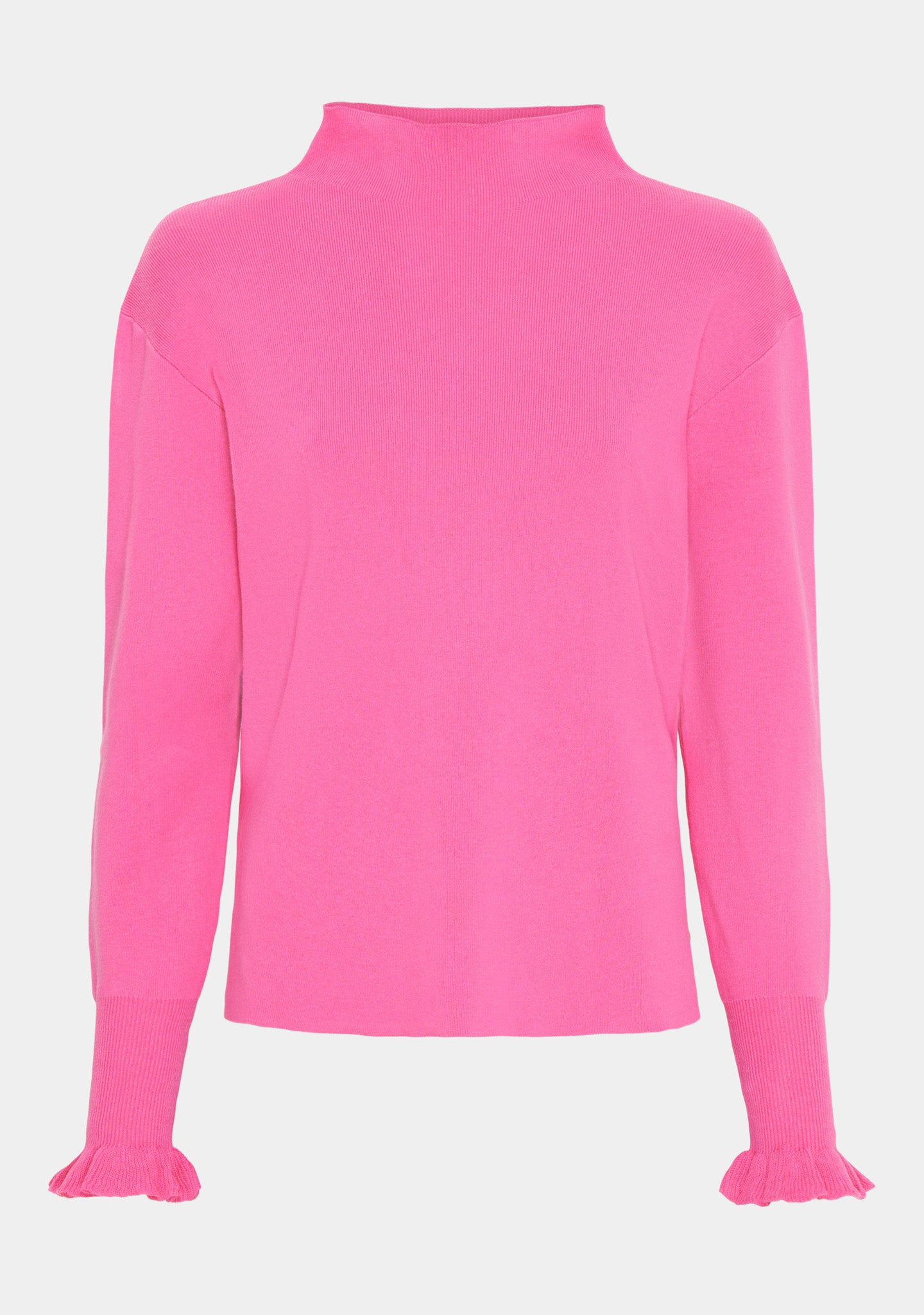 Tröjan Frigga New Pullover är en elegant och stilfull tröja med hög krage och åtsittande ärmar dekorerade med en vacker volangkant. Den är tillverkad av en bekväm bomullskvalitet med lite stretch, vilket ger en skön passform. Tröjan har ett Isay signaturmärke nertill och små sprundar på varje sida. Du kan komplettera din look genom att styla tröjan med dina höga jeans och en snygg kavaj.