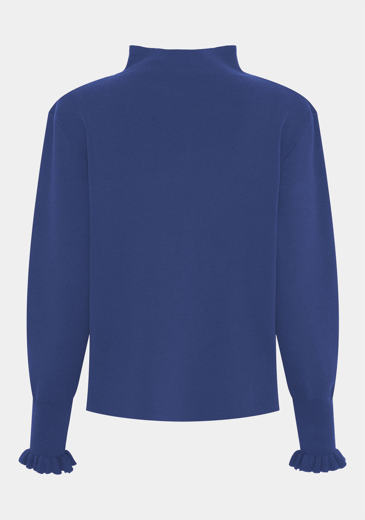 Tröjan Frigga New Pullover är en elegant och stilfull tröja med hög krage och åtsittande ärmar dekorerade med en vacker volangkant. Den är tillverkad av en bekväm bomullskvalitet med lite stretch, vilket ger en skön passform. Tröjan har ett Isay signaturmärke nertill och små sprundar på varje sida. Du kan komplettera din look genom att styla tröjan med dina höga jeans och en snygg kavaj.