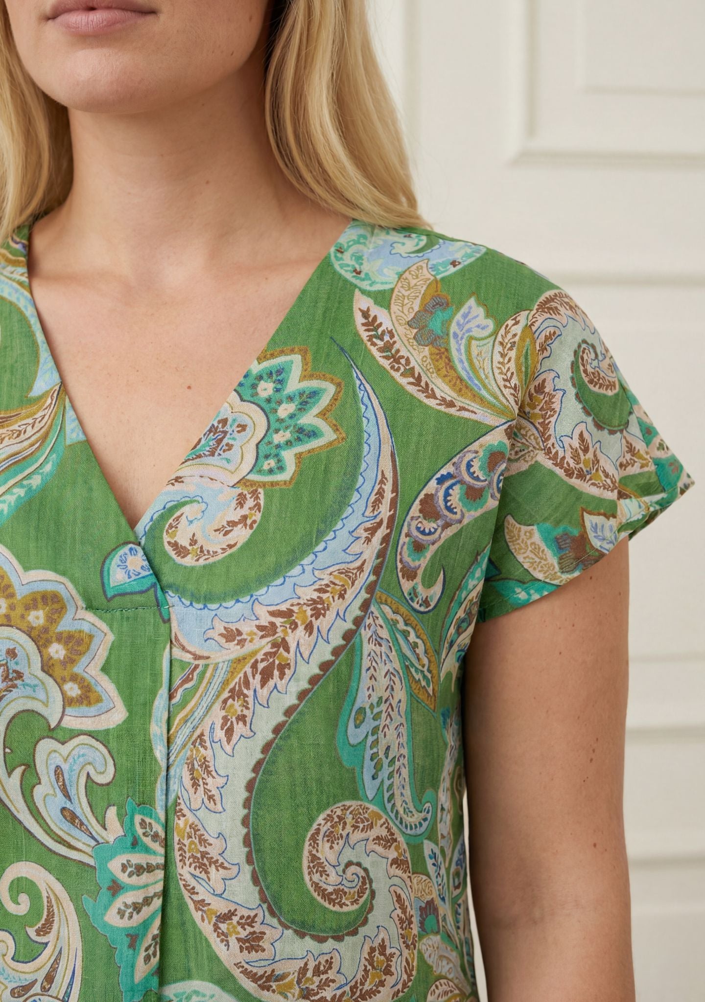 Styla den med jeans för en avslappnad vardagslook – eller med lätta byxor och sandaler, när du vill ha en somrig känsla. Den fungerar också bra under en kavaj, där mönstret får liv åt en mer nedtonad look.