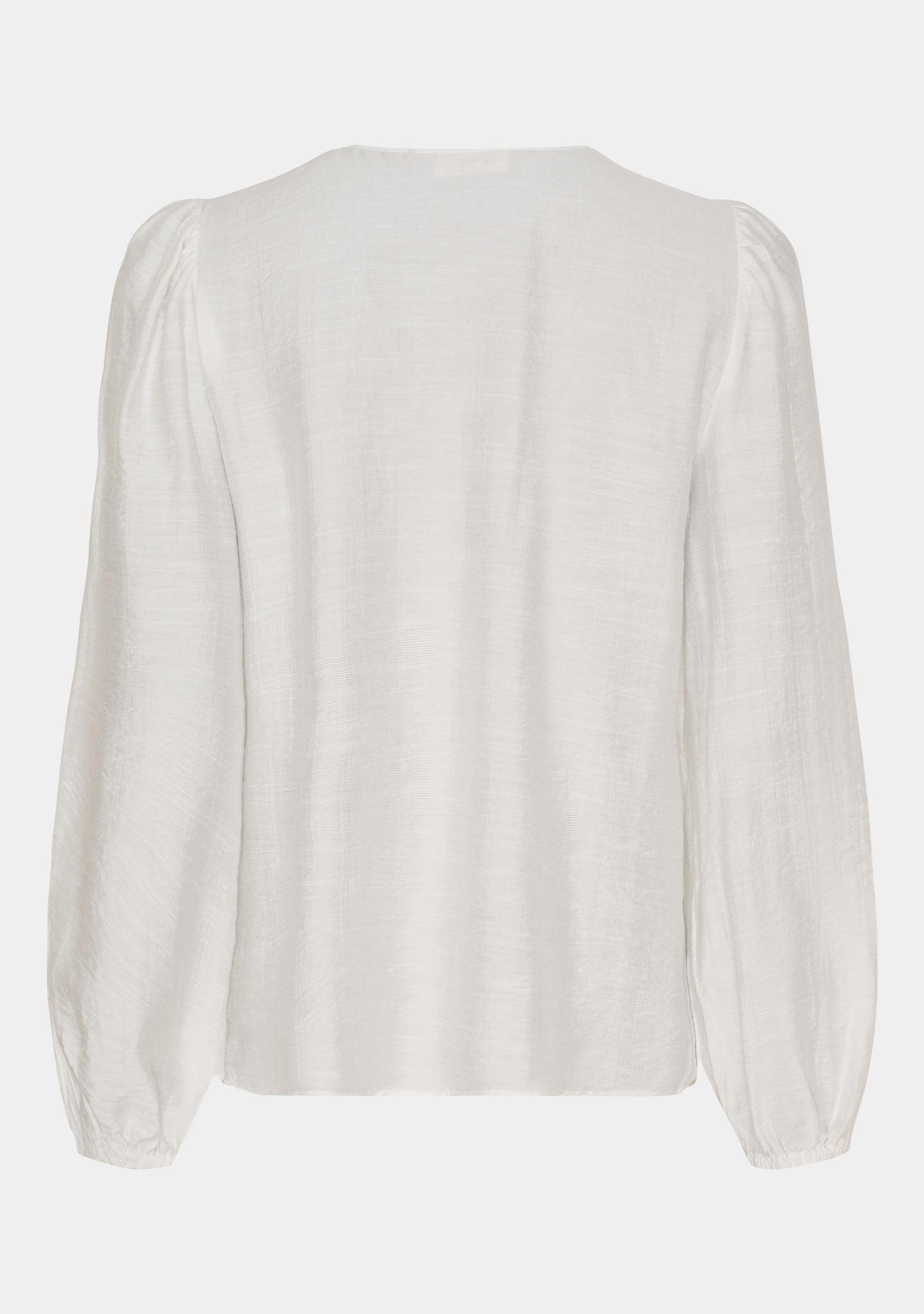 Lykke V-Neck Blouse är en elegant blus med vackra detaljer och feminint uttryck. Den har en v-ringning med dekorativ knappslå, där små veck ger liv och struktur åt designen. Sömmen under bysten skapar en smickrande silhuett, medan de långa ärmarna har en lätt puff och avslutas med elastiska muddar för en bekväm passform. Blusen är tillverkad i en mjuk viskosblandning med polyamid, som känns skön mot huden och har ett vackert fall.