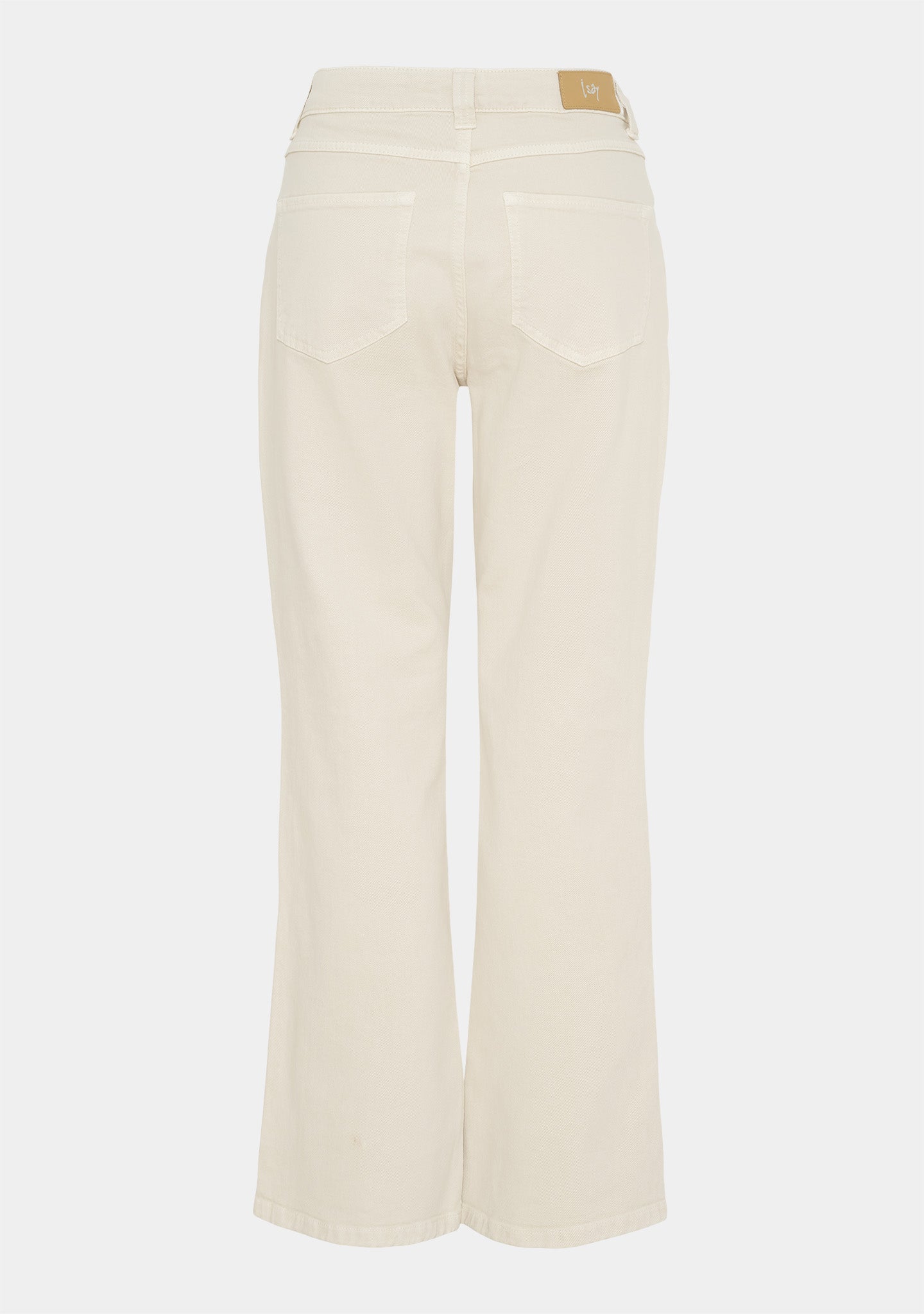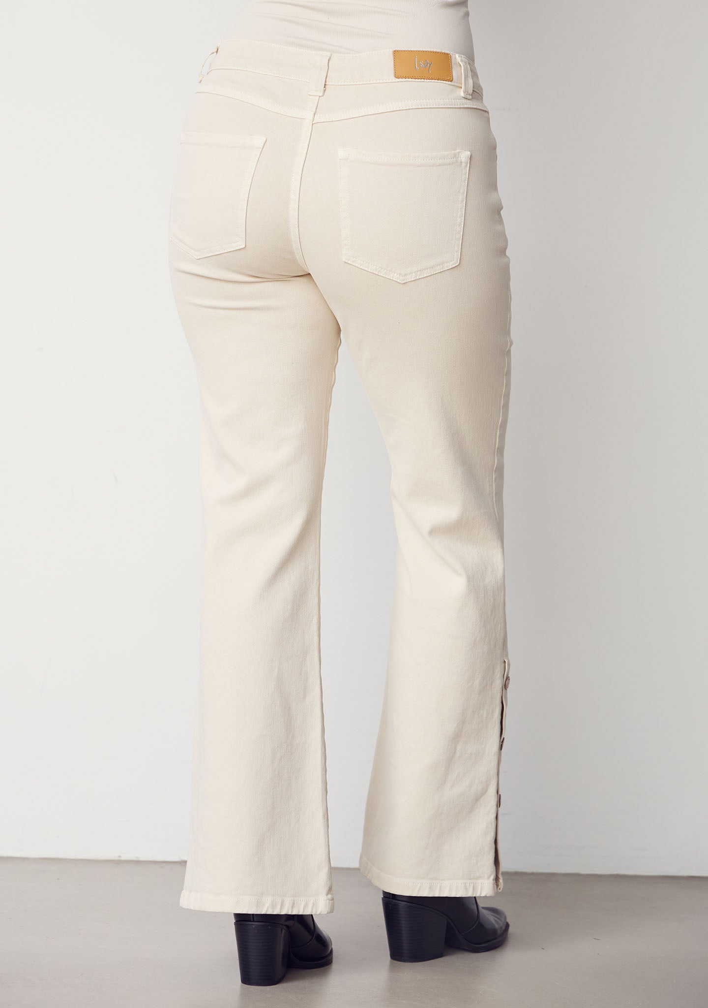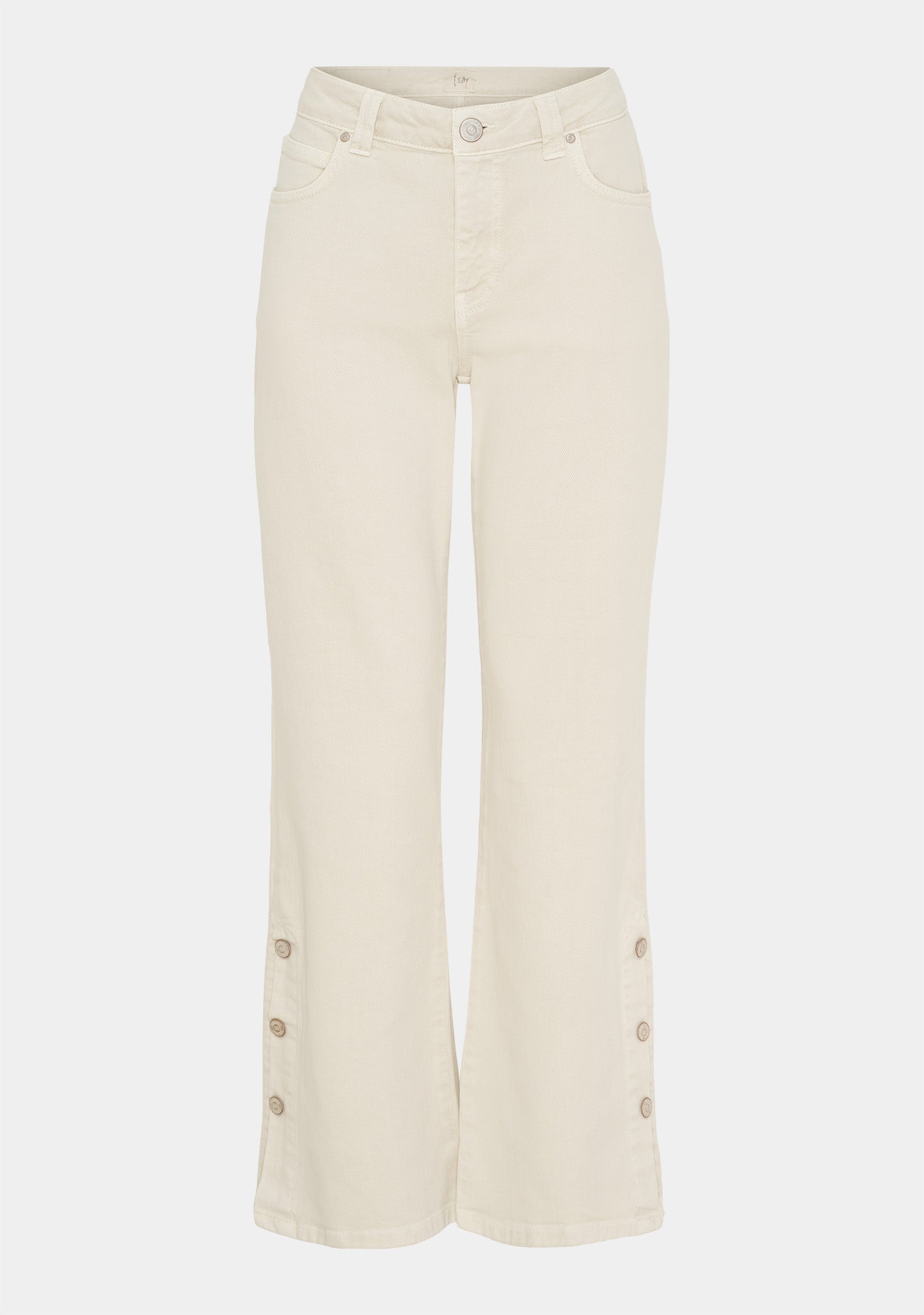 Como Twill Button Pant kombinerar klassiska denimdetaljer med en feminin twist. Den smickrande flare passformen sitter tätt runt höfterna och låren och ökar i bredd från knät neråt. Dekorativa knappar vid ankeln ger en elegant och unik touch. Byxorna är tillverkade i en mjuk bomullsblandning med stretch, vilket garanterar hög komfort och god rörelsefrihet hela dagen. Fast linning med bältesögla, klassisk 5-ficksdesign och dragkedja med knapp avslutar looken.