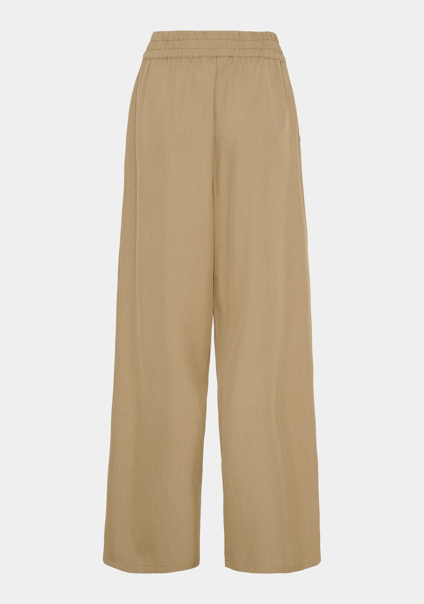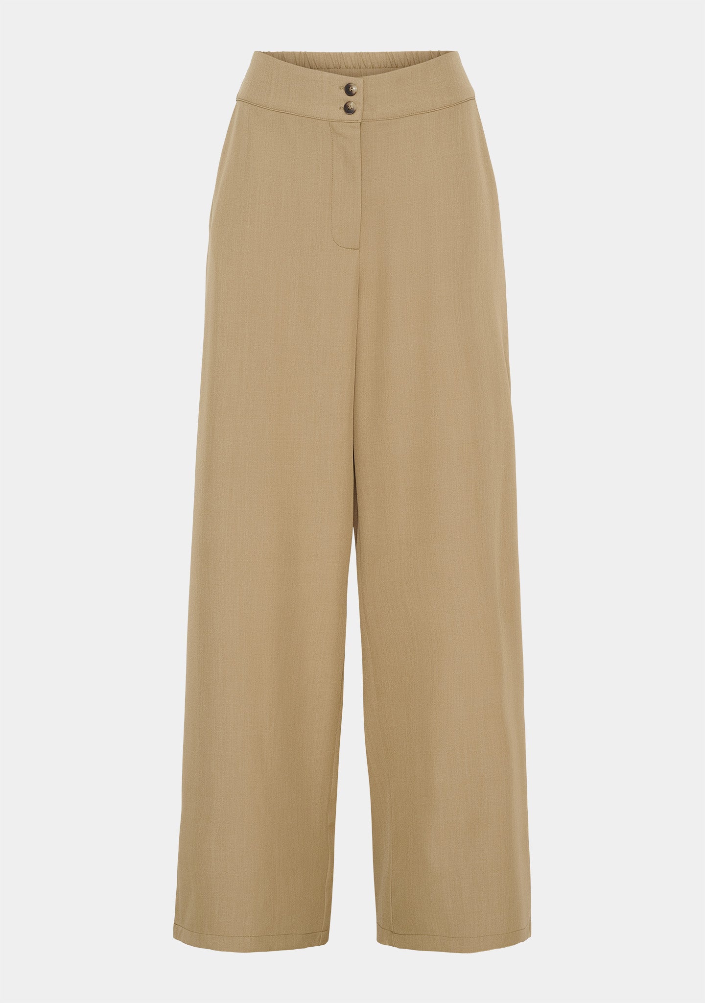 Liona Pant är ett par eleganta byxor med avslappnad passform och mycket komfort. De har en smickrande hög midja med fast framsida och elastisk baksida, vilket säkerställer både en snygg look och en bekväm passform. Byxorna har vida ben som faller vackert och skapar en tidlös silhuett. Tillverkade i en lätt och elastisk polyesterblandning med elastan, vilket ger både rörelsefrihet och ett stabilt uttryck.