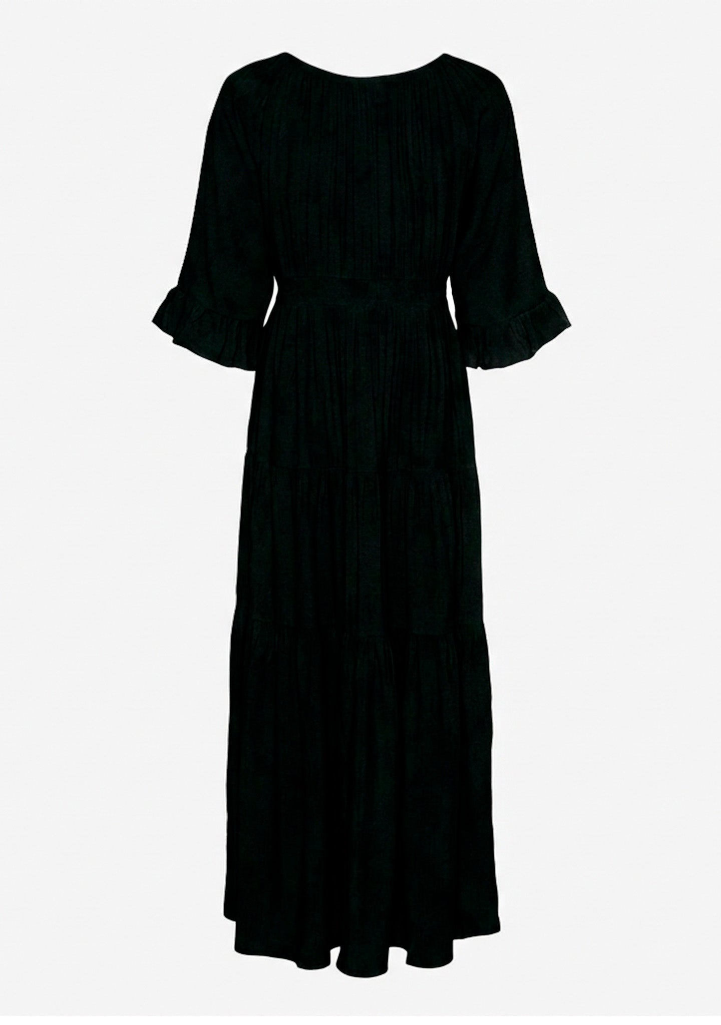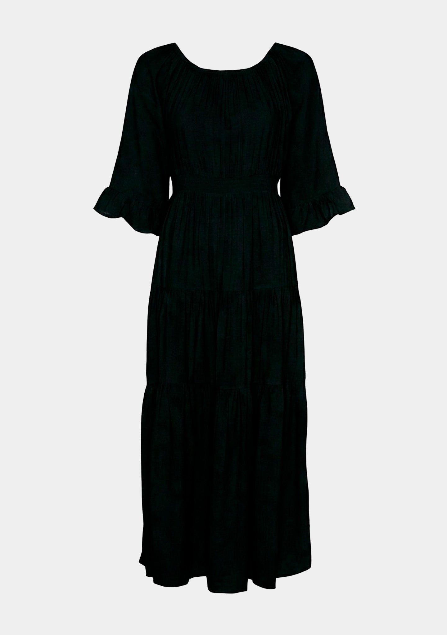 Den elastiska smockkanten över axlarna gör att du kan bära den både off shoulder och klassiskt – beroende på humör. Passformen faller löst och lätt över kroppen, och den långa längden ger den vacker rörelse när du går.