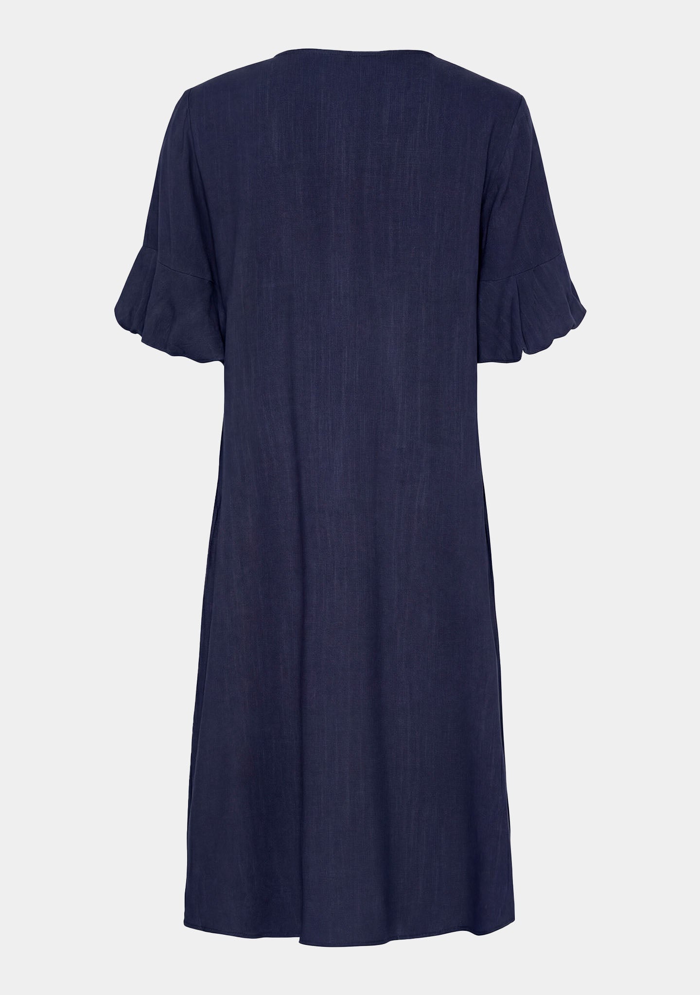 Ballongärmarna ger klänningen karaktär. De har en mjuk volym och slutar runt armbågen, vilket skapar en fin balans mellan det avslappnade och det mer eleganta. Det är detaljen som får klänningen att kännas genomtänkt - utan att vara för mycket.