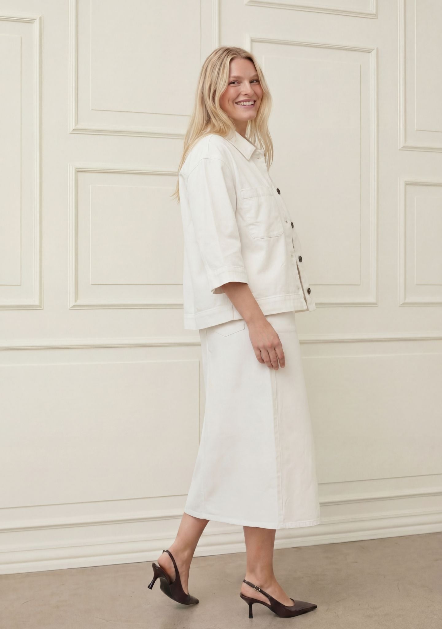 Den korta längden ger en fin balans i siluetten och fungerar särskilt bra över klänningar och med höga byxor. De 3/4-långa ärmarna ger en lätt och avslappnad look, vilket gör jackan idealisk både som övergångsplagg och som en lätt sommarjacka.