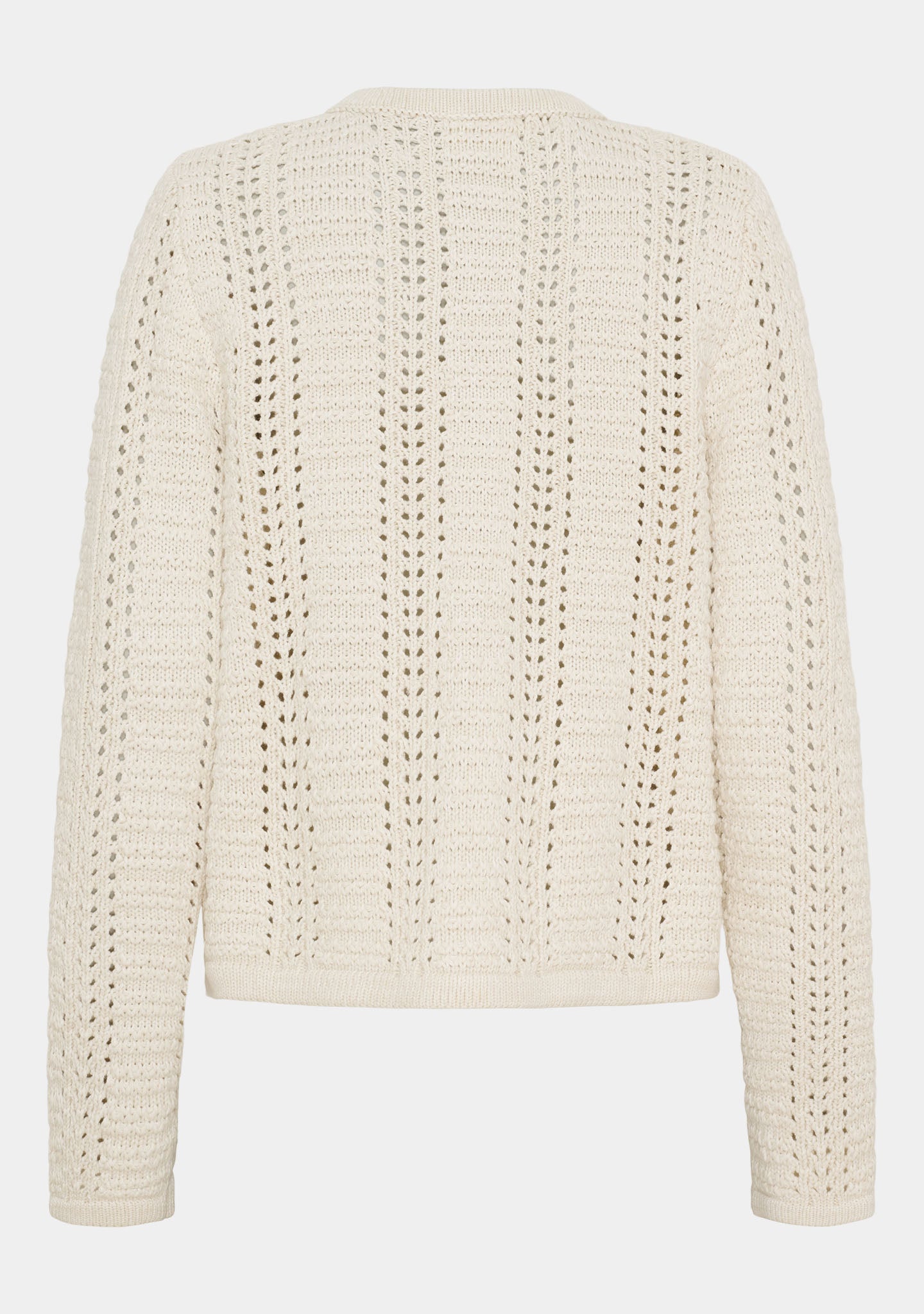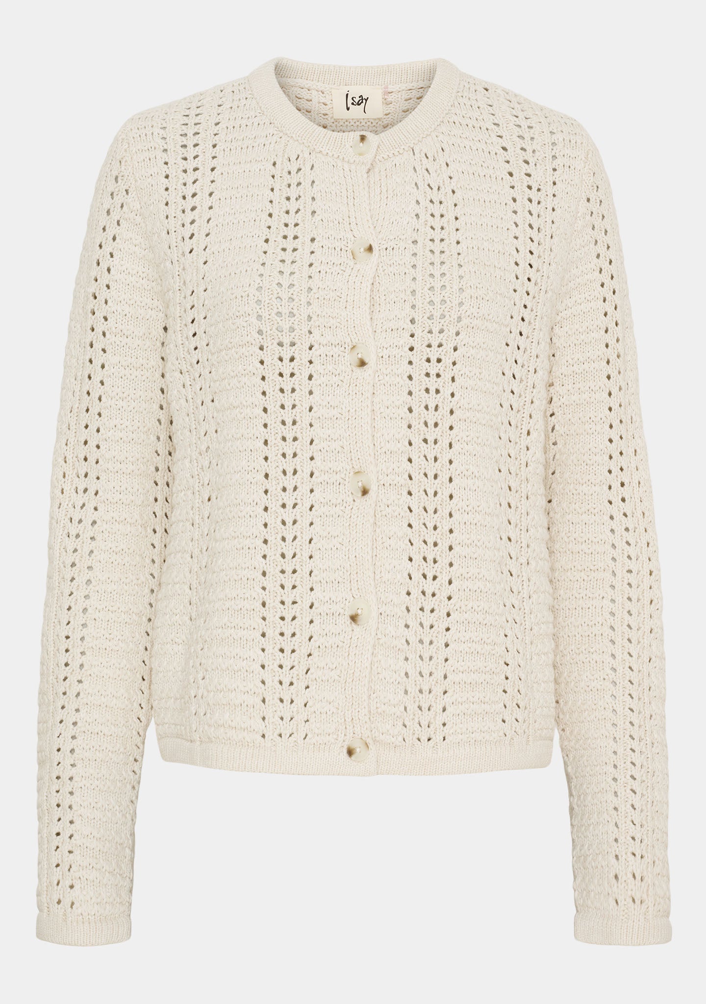 Gwen Cardigan är en lätt och stilren kofta som kombinerar klassisk design med en modern öppenstickning. Den har en normal passform, rund hals och genomgående knappar, vilket gör den mångsidig och lätt att styla. Den lätta stickkvaliteten ger en bekväm look, vilket gör koftan perfekt för både lager-på-lager-styling och som ett fristående statement-plagg. Tillverkad i en mjuk bomullsblandning med akryl, vilket gör den bekväm, lätt och formbeständig.