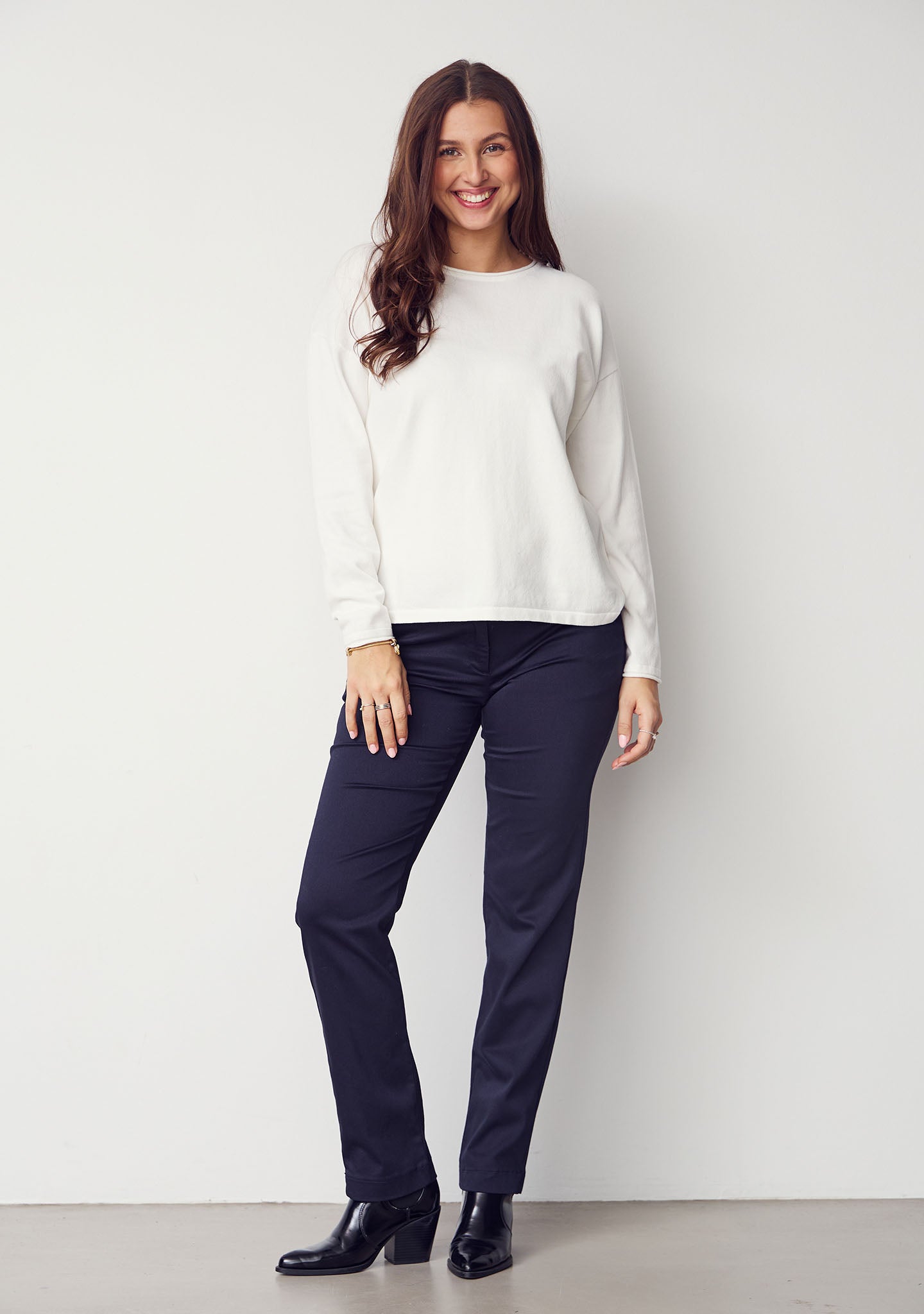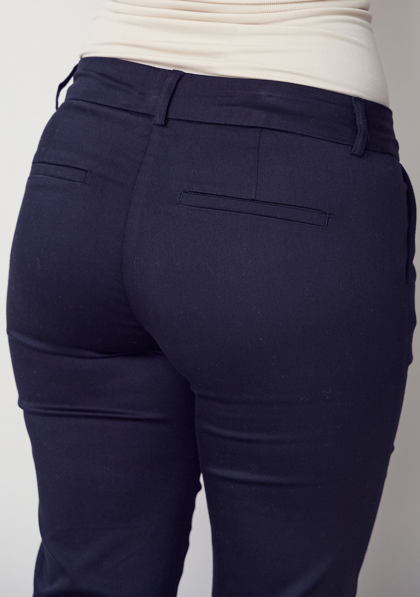 Här är våra klassiska byxor, Isay Classic Pant. De har en mediumhög midja och en tidlös passform som sitter tätt runt höfterna, är något lösare vid benen och smalnar av mot ankeln. Isay Classic Pant har en elegant och klassisk design och är bekväma att bära hela dagen. De är tillverkade främst av bomull, polyester och elastan, vilket ger dig utmärkt rörelsefrihet och säkerställer att de sitter bra på kroppen. Byxorna har ett fast midjeband som stängs med två knappar, bälteshällor, fickor och kommer i full längd.