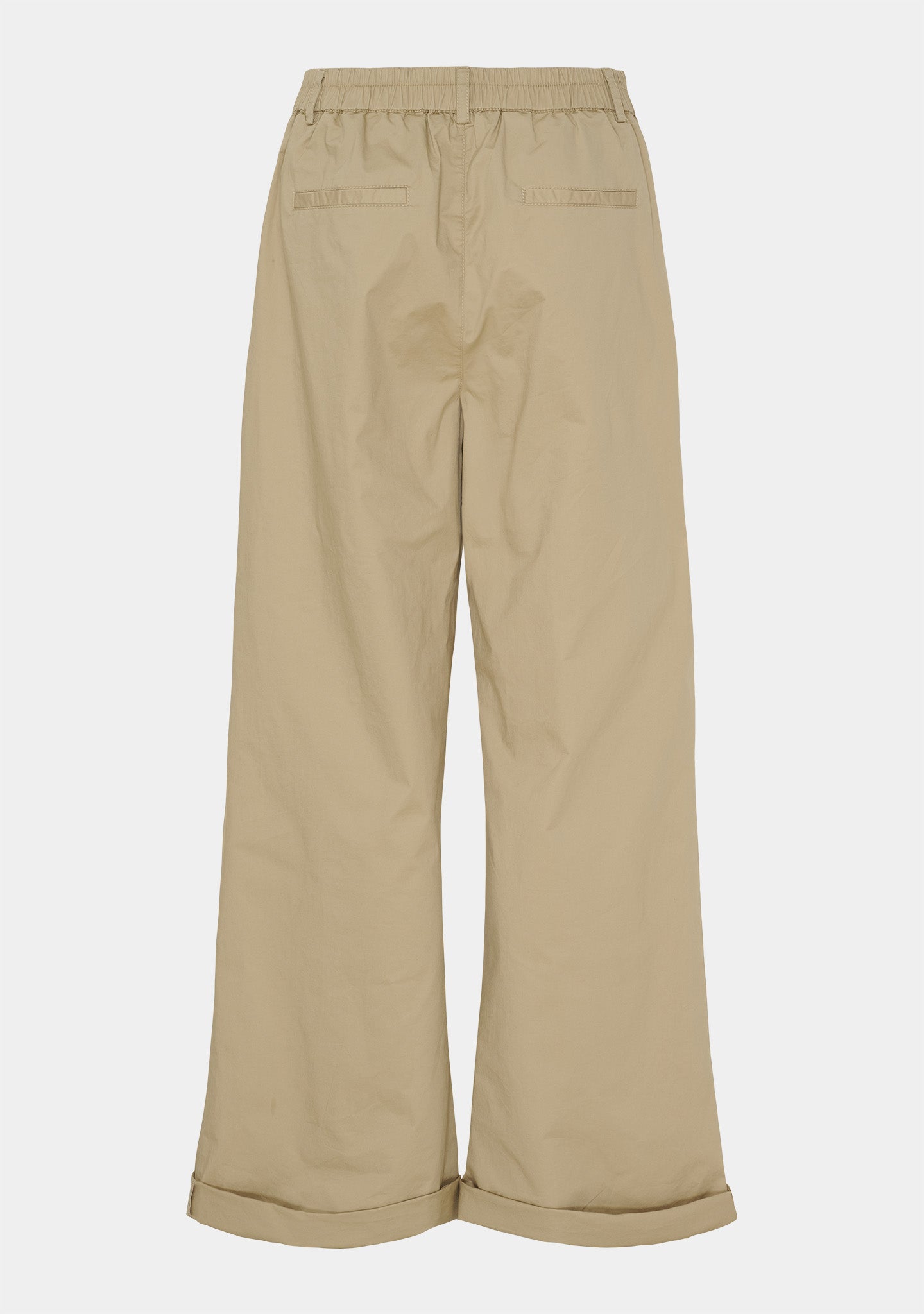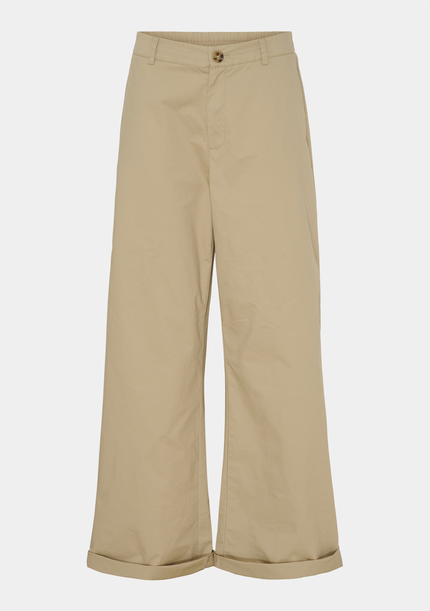 Silhuetten är vid och rak från höften och neråt. De långa benen med uppvik nedtill ger lite tyngd och säkerställer att byxorna faller vackert och lugnt – utan att klibba sig fast på kroppen. Med en innerbenslängd på 80 cm är det en stil som adderar längd till utseendet och fungerar särskilt bra med klackar, men de kan enkelt kläs ned med sneakers.