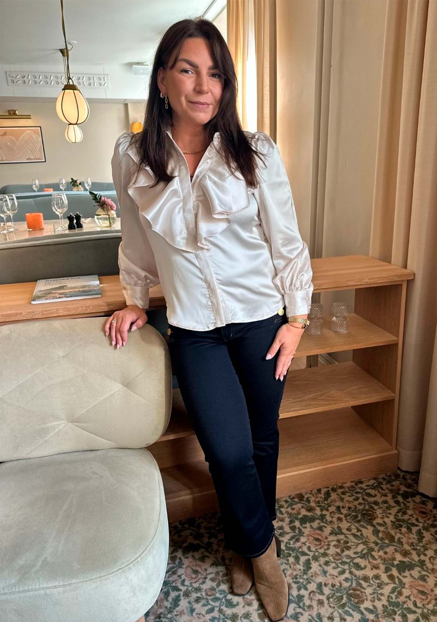 Kala Shirt är en sofistikerad skjorta med vackra detaljer som ger en feminin och exklusiv utstrålning. Den har en dekorativ volangdetalj framtill och en klassisk skjortkrage, vilket gör den lämplig för både festliga och formella tillfällen.