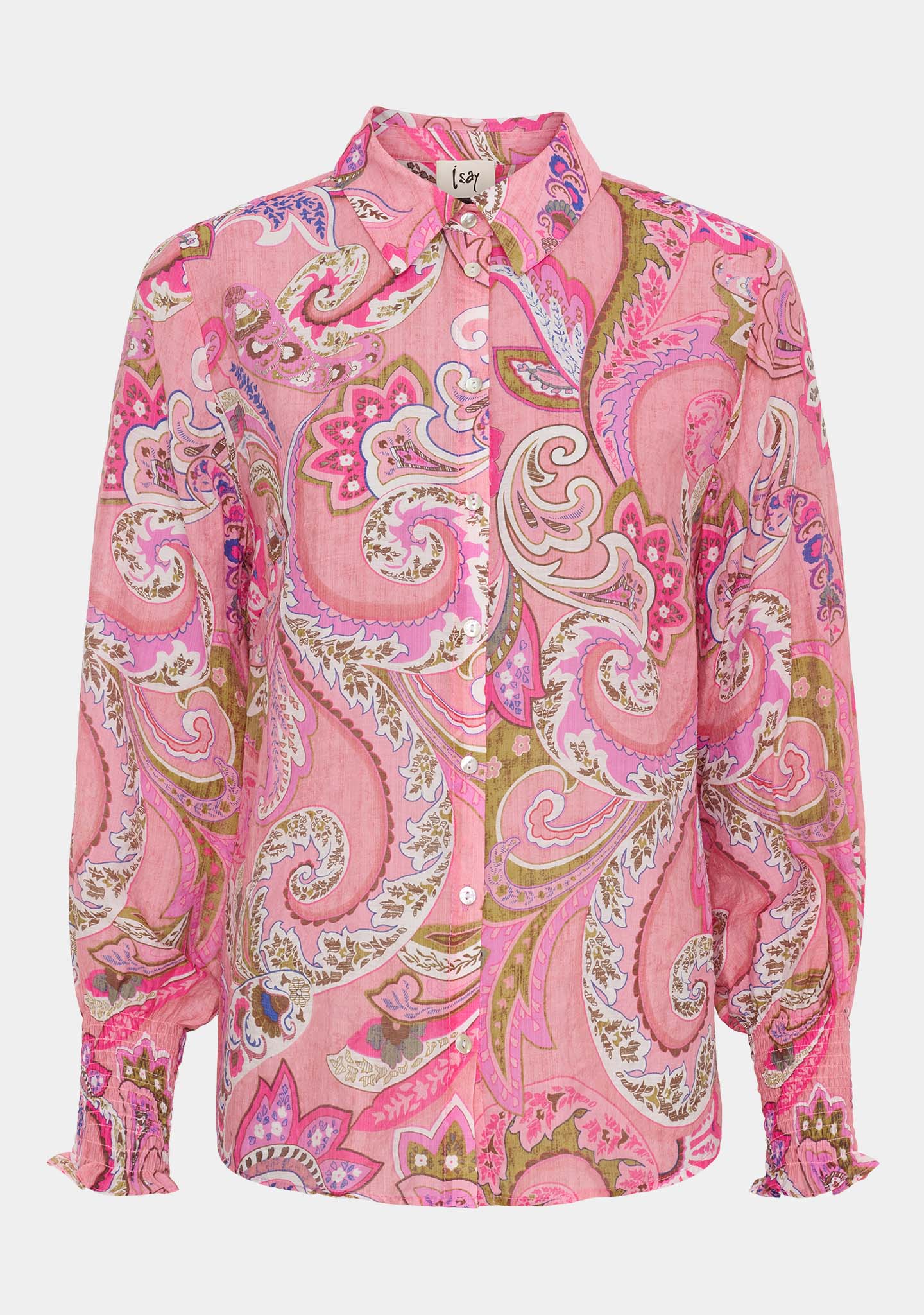 Lotta Smock Shirt är en feminin och luftig skjorta med en vacker drapering och en bekväm silhuett. Den avslappnade passformen kombineras med klassiska detaljer som skjortkrage och hel knappknäppning, medan de långa ärmarna avslutas med elastisk smock och en liten rynkkant, vilket ger en feminin touch. Skjortan är tillverkad av en lätt genomskinlig viskosblandning med polyamid, som känns mjuk mot huden och faller vackert runt kroppen.