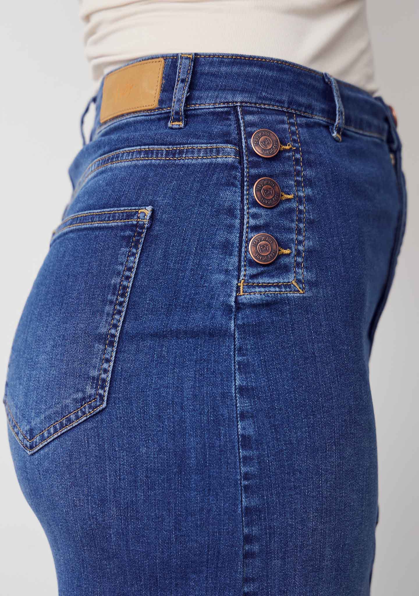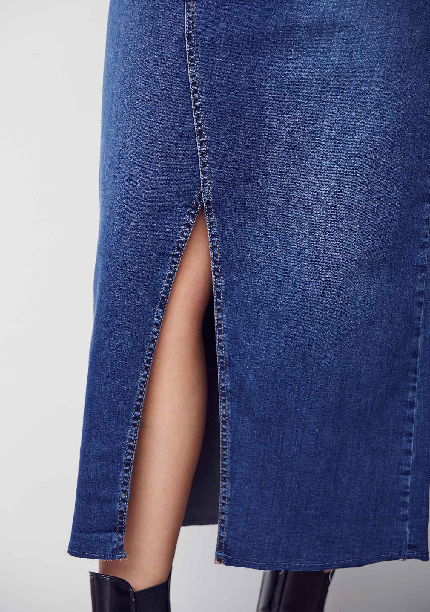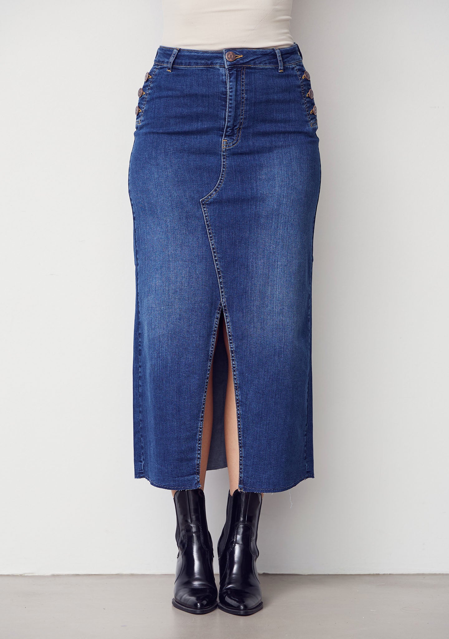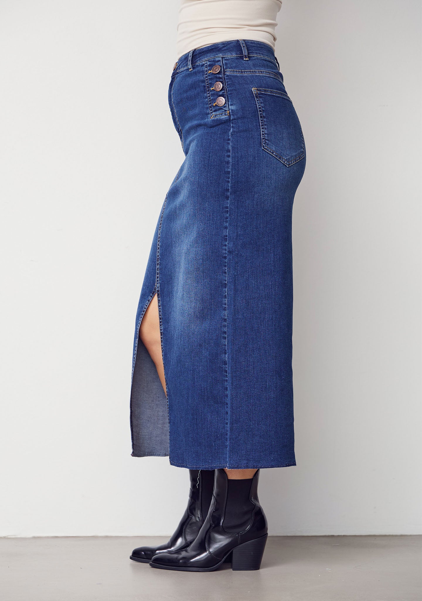 Möt den mest imponerande jeanskjolen vi någonsin har presenterat! Inspirerad av våra populära Como-byxor, för denna kjol det bästa av två världar. Como Denim Kjol är designad för att vara mångsidig och bekväm, så att du kan bära den till arbete eller en helgbrunch med vänner. Designen inkluderar de karakteristiska tre knapparna som ersätter traditionella sidfickor, kompletterade med praktiska bakfickor. Den fasta midjan med hällor för bälte säkerställer att kjolen sitter på plats, och den eleganta slitsen ger kjolen optimal rörelsefrihet och möjligheten att visa upp benen. Como Denim Kjol har en cool, förbehandlad look som får dig att se bra ut och må bra. Missa inte denna säsongens måste-ha jeanskjol.