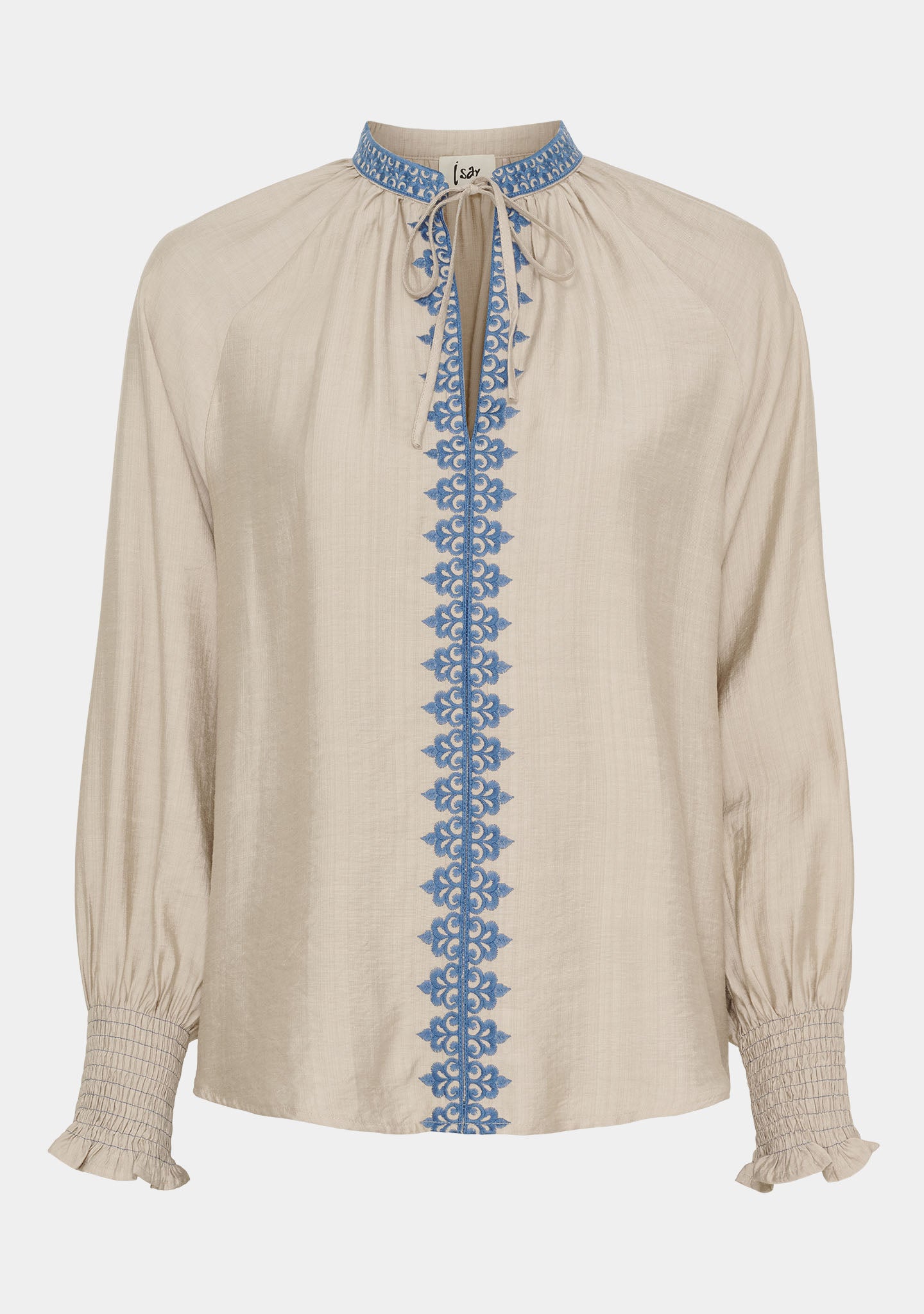Lykke Deco Blouse är en vacker och feminin blus som kombinerar komfort med fina detaljer. Den har en liten ståkrage med knytband, och framtill löper en dekorativ broderidetalj som ger ett exklusivt uttryck. De långa ärmarna är avslutade med smock och en lätt volangkant, vilket betonar blusens feminina karaktär. Tillverkad i en mjuk viskosblandning med polyamid som känns skön mot huden och faller vackert längs kroppen.